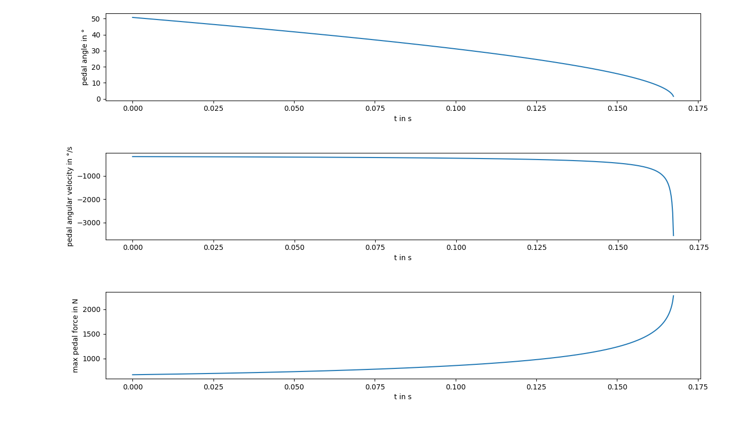 To get a better understanding of the motion and forces, a python script for simulation of the pedal angle, the pedal angular velocity and maximum pedal force has been written. Feel free to tune the pedal geometry as needed. The simulation result for my pedal geometry looks as follows: